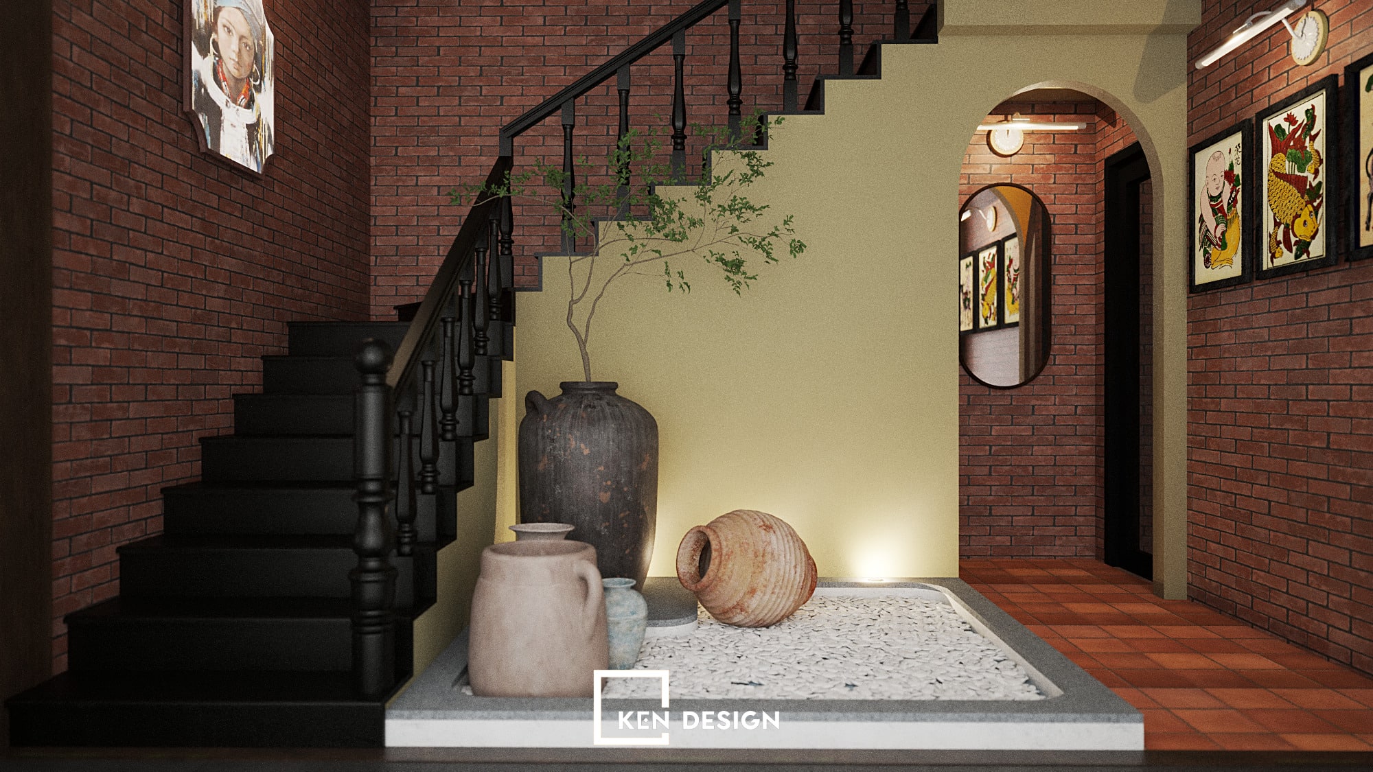 The overarching concept of the project is “Recreating the Northern Vietnamese village atmosphere in a contemporary context.” Rather than copying old rural imagery directly, the design selectively extracts emotionally resonant elements such as tiled roofs, brick walls, village gates, shutters and countryside visuals, then reinterprets them in a modern spatial language.