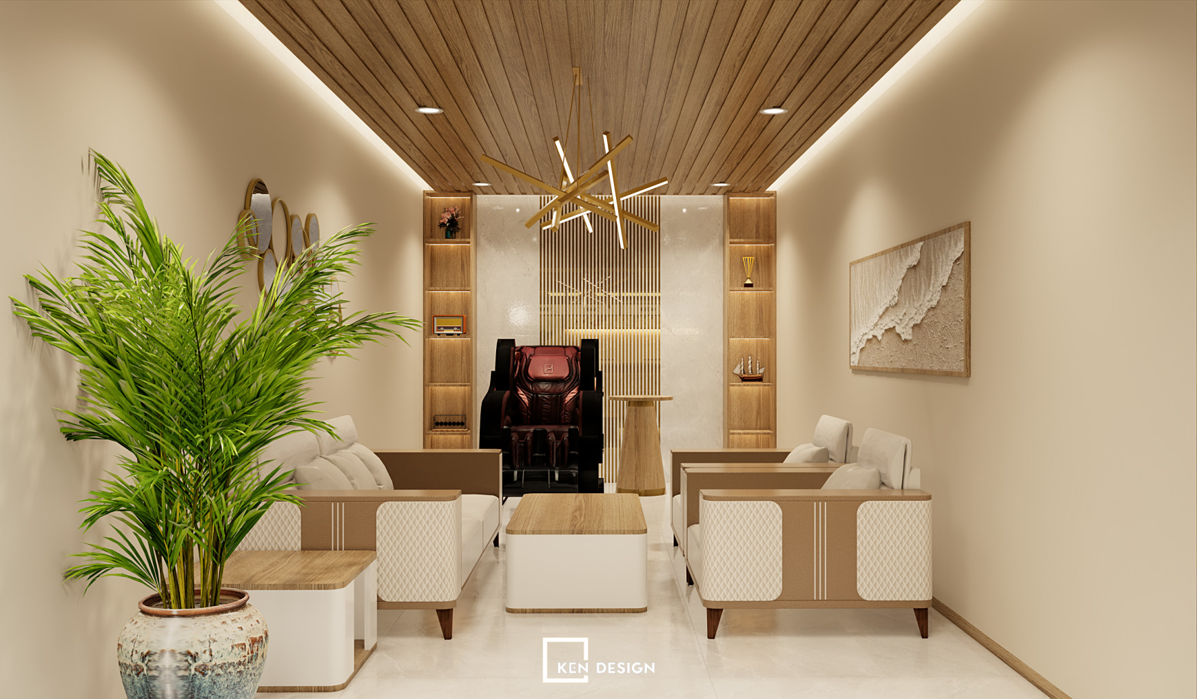 Materials are selected with consistency and purpose. Furniture uses light toned wood combined with light leather upholstery to create a clean and comfortable atmosphere. Decorative elements are kept minimal, emphasizing form and material quality over excessive ornamentation. Textured paint finishes and decorative stone cladding are applied at key locations to add spatial depth while ensuring durability for long term operation.
