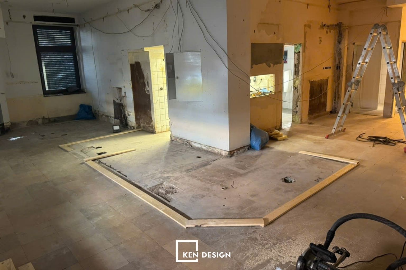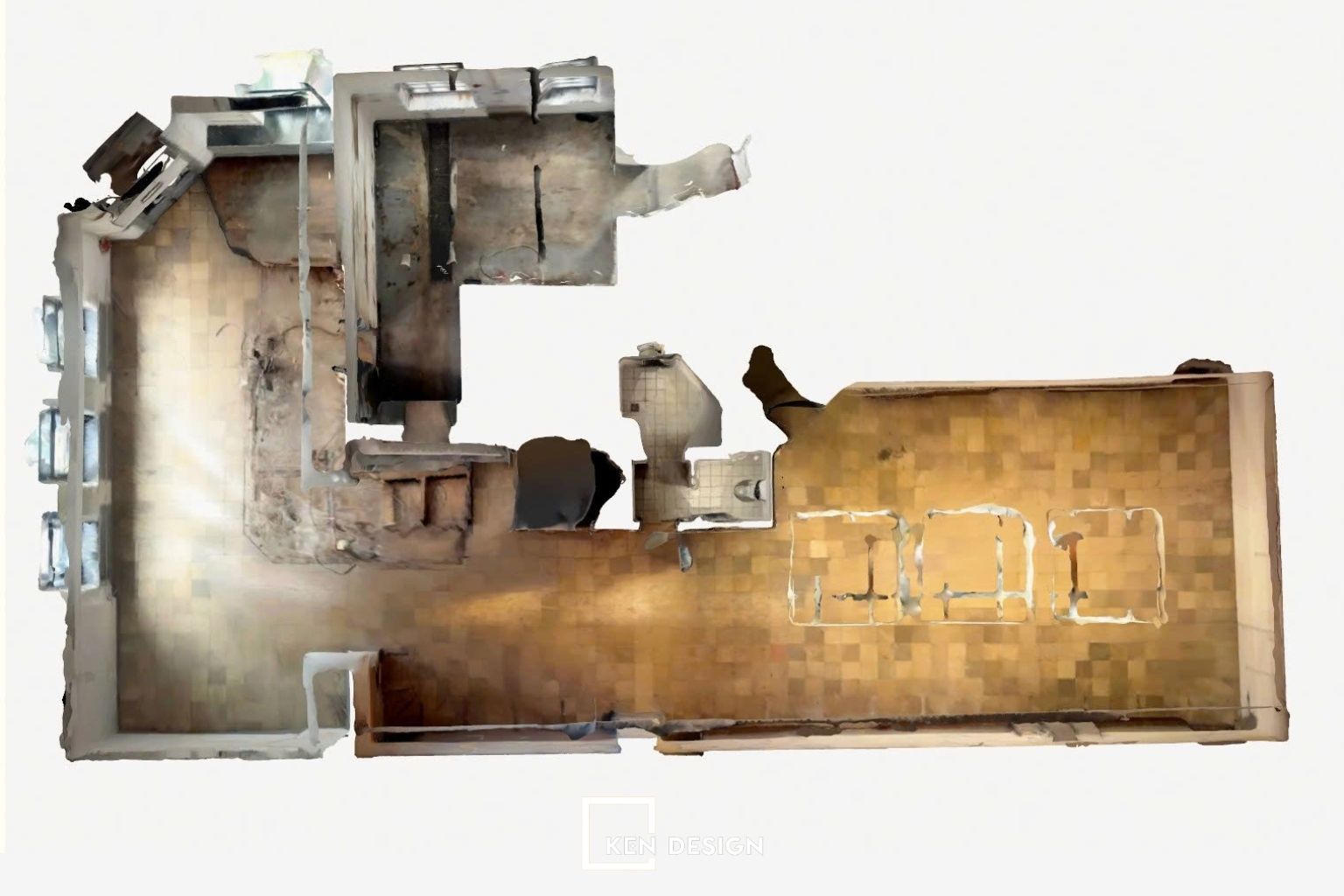 3D-Scans zeigten, dass die gesamte alte Inneneinrichtung entfernt worden war und nur noch der Rohbau mit altem Bodenbelag und vielen unbearbeiteten Flächen übrig war. Auch die Baustellenfotos verdeutlichten den stark abgenutzten Zustand: fleckige Wände, sichtbare Elektro- und Wasserleitungen, niedrige Decken und unebene Böden. Das Team musste den Bestand sorgfältig analysieren und geeignete Lösungen finden, um daraus ein frisches, vietnamesisch geprägtes Restaurant entstehen zu lassen.