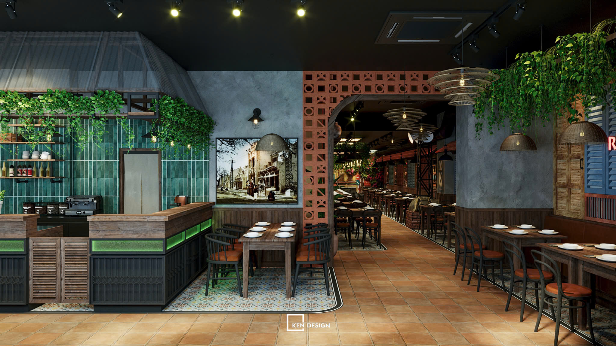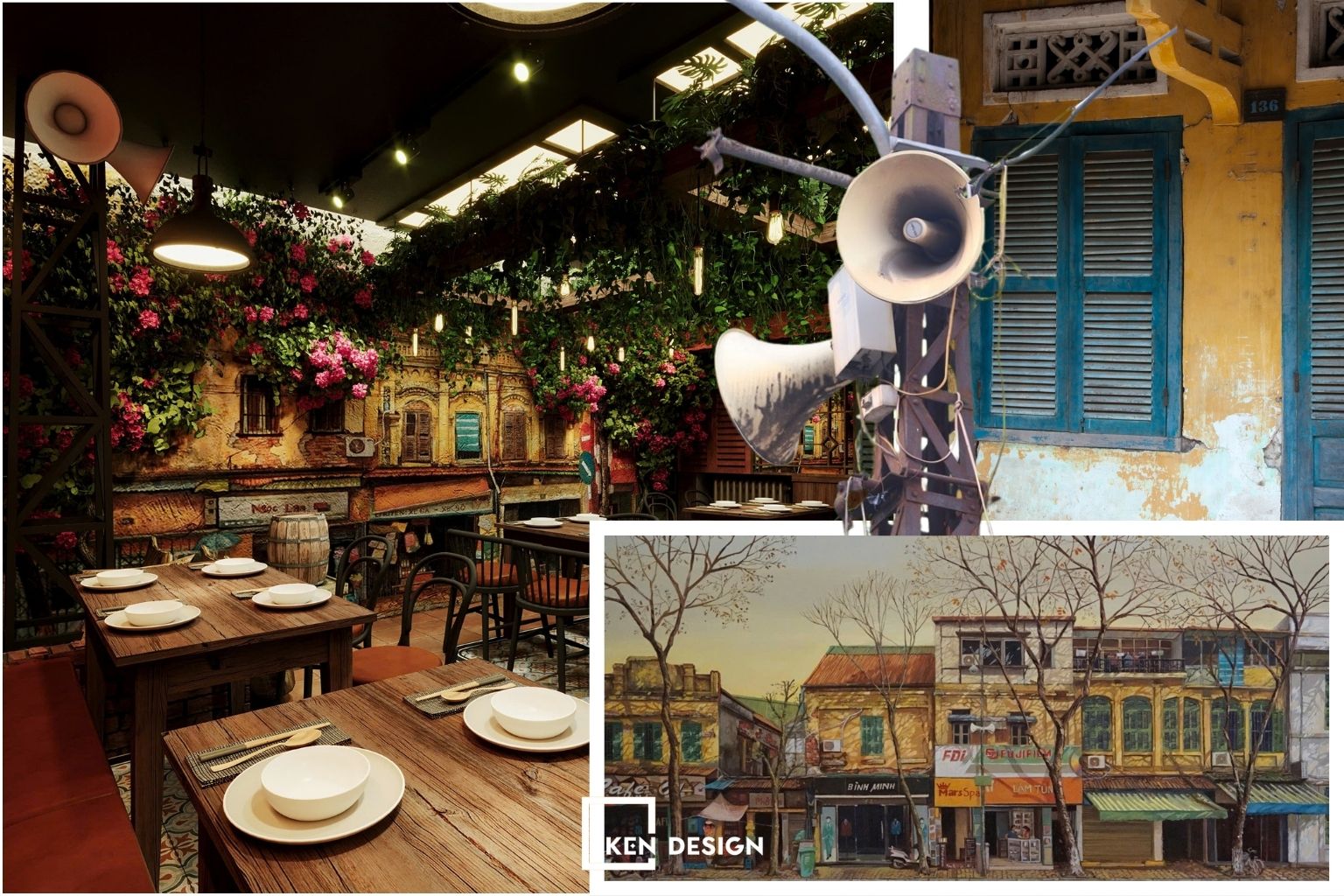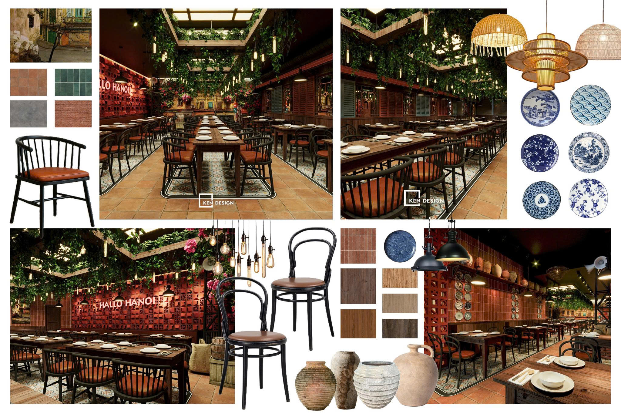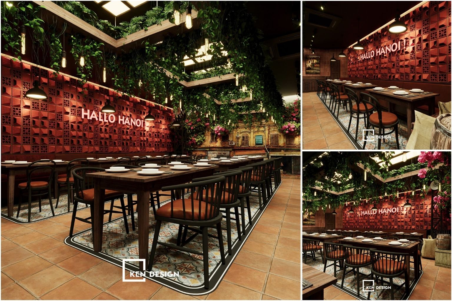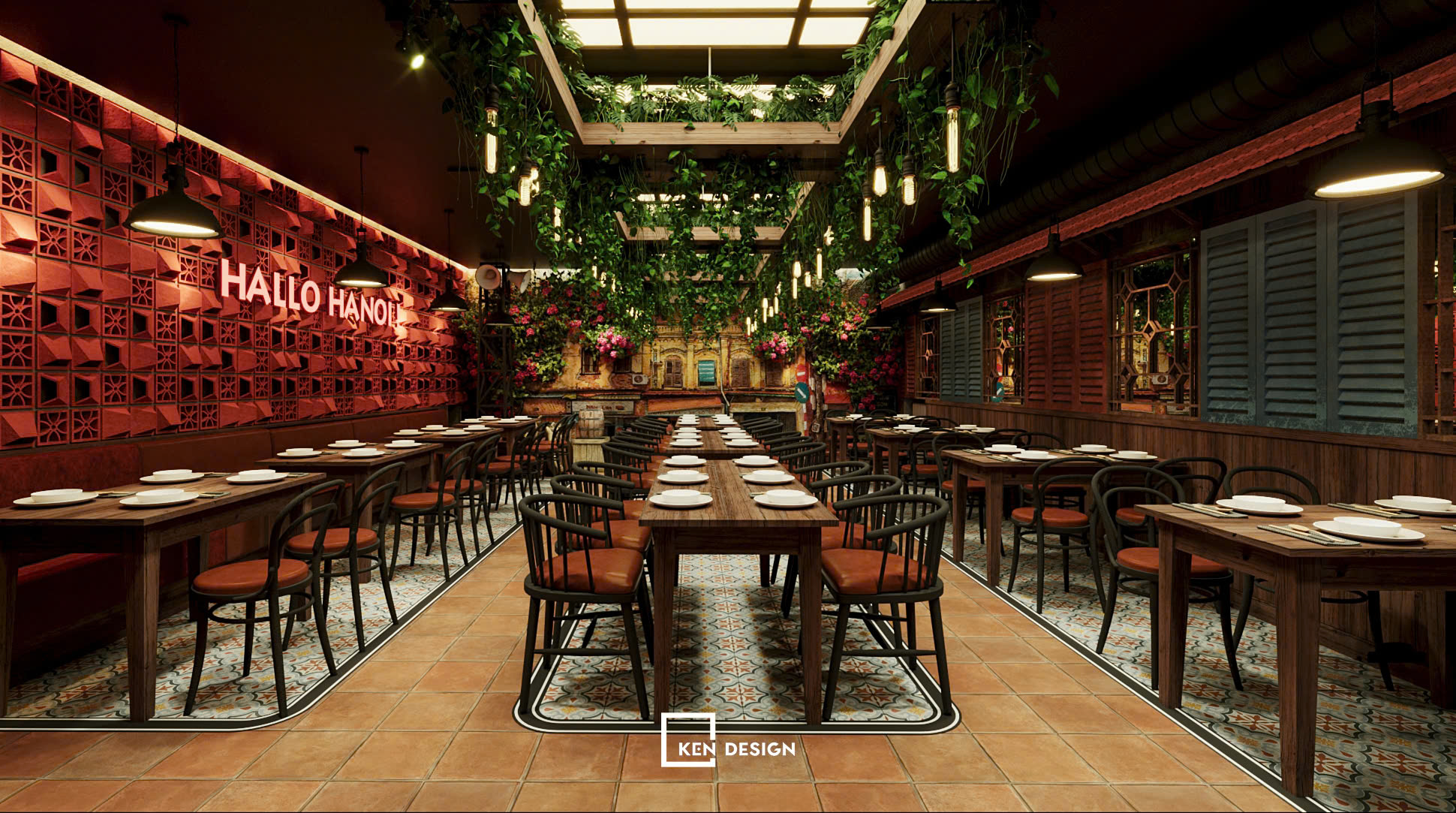 Das Restaurant folgt dem Stil Modernes Vietnam, inspiriert von der Architektur der Altstadt Hanois. Ken Design kombinierte traditionelle Materialien wie Lüftungsziegel, Ziegeldächer, Holztüren und Volkskunst mit modernen Elementen wie Lichtgestaltung und Begrünung.
